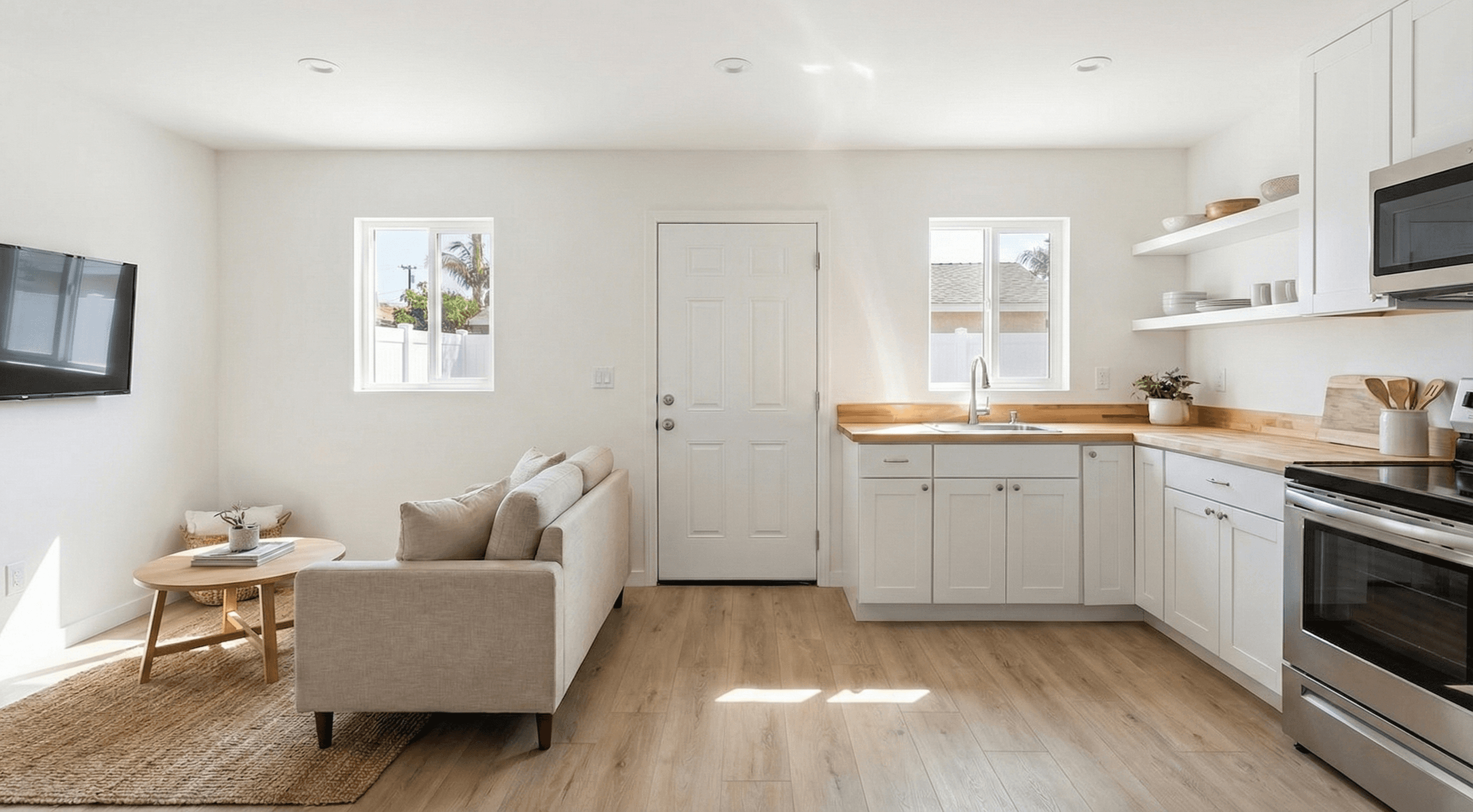 A 600 sq ft, 2-bedroom, 1-bath ground-up ADU in Long Beach, designed to maximize livability within a compact footprint. The layout balances efficiency, natural light, and long-term rental flexibility, delivered as a fully permitted, move-in-ready unit.